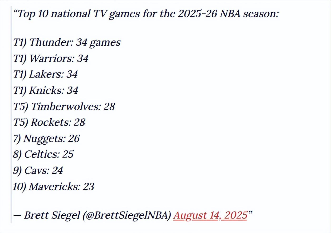 新赛季全美直播的场数方面,雷霆、勇士、湖人、尼克斯四队同为34场,并列第一。随后是森林狼和火箭,同为28场,掘金26场、凯尔特人25场、骑士24场、独行侠23场。