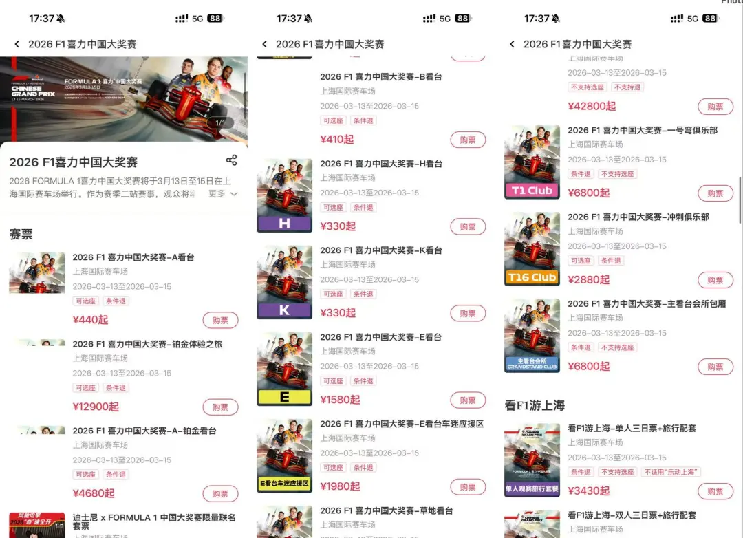 自2025年12月11日上午11时正式开票以来,赛事的票房就展现了惊人的爆发力。从开票至今已过去3个月,蓝鲸记者查询发现,截至发稿,2026赛季F1中国大奖赛所有类别的门票已全部售罄。其中,包含高达42800元的围场票及12900元的铂金票在内,各档位均显示无余票。